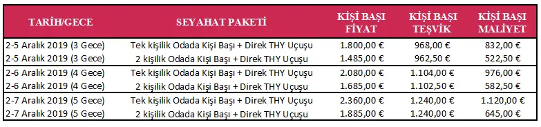 | Konaklama Tarihleri | KONAKLAMA + UÇAK | Tek Kişi Fiyatı | Tek Kişi Teşvik | Tek Kişi Maliyet |