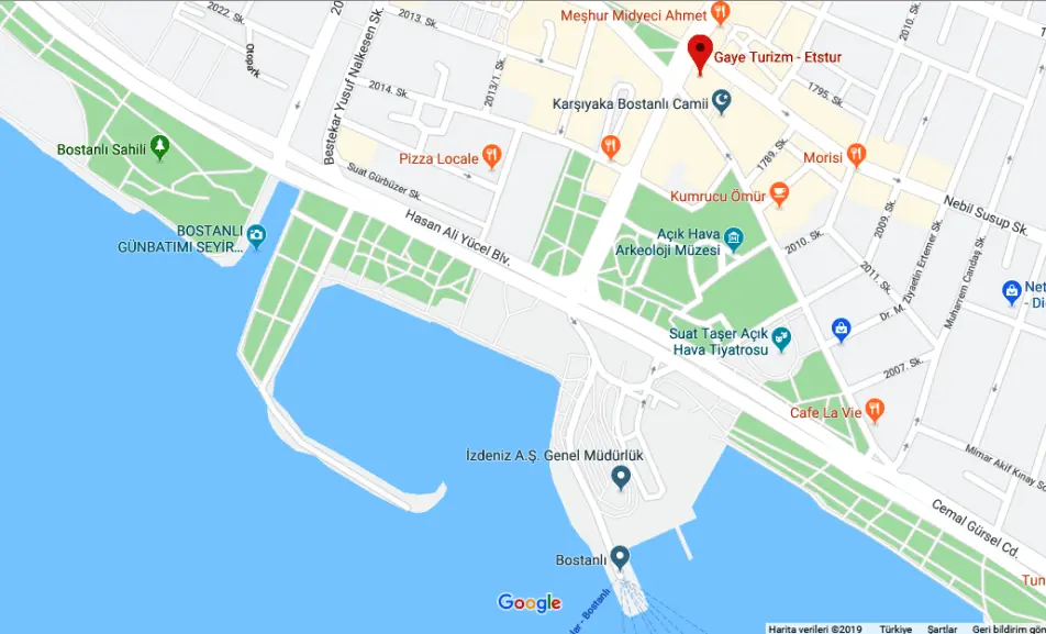 İzlence / Gaye TurizmTURSAB No: 3199ETS Tur AcentesiBostanlı Cami Yanı - Bostanlı İzmirAçık Adres:Yalı Cad. No:488/B ( Bostanlı Cami Yanı) Karşıyaka / İzmirÇalışma Saatleri: Hafta içi 09:00 - 18:00 Cumartesi 09:00 - 16:00